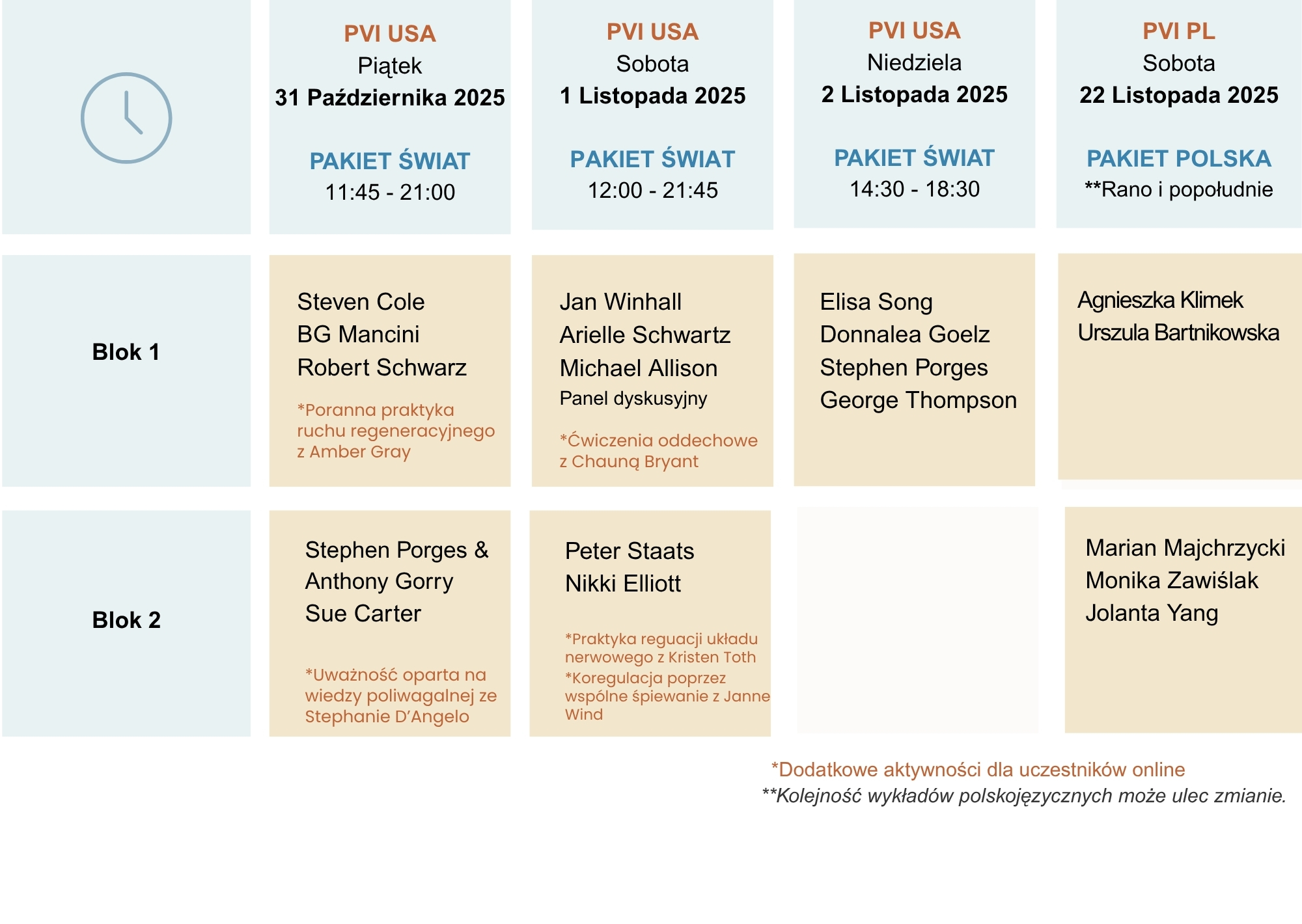 🔹 Pierwsza część (31.10–02.11) – połączyliśmy się z Polyvagal Institute USA w ramach międzynarodowego PVI Gathering 2025. Nagrania z transmisji prosto z Florydy są dostępne z tłumaczeniem symultanicznym na język polski. To niepowtarzalna okazja, aby stać się częścią globalnej społeczności, która zmienia sposób, w jaki rozumiemy zdrowie, relacje i dobrostan.